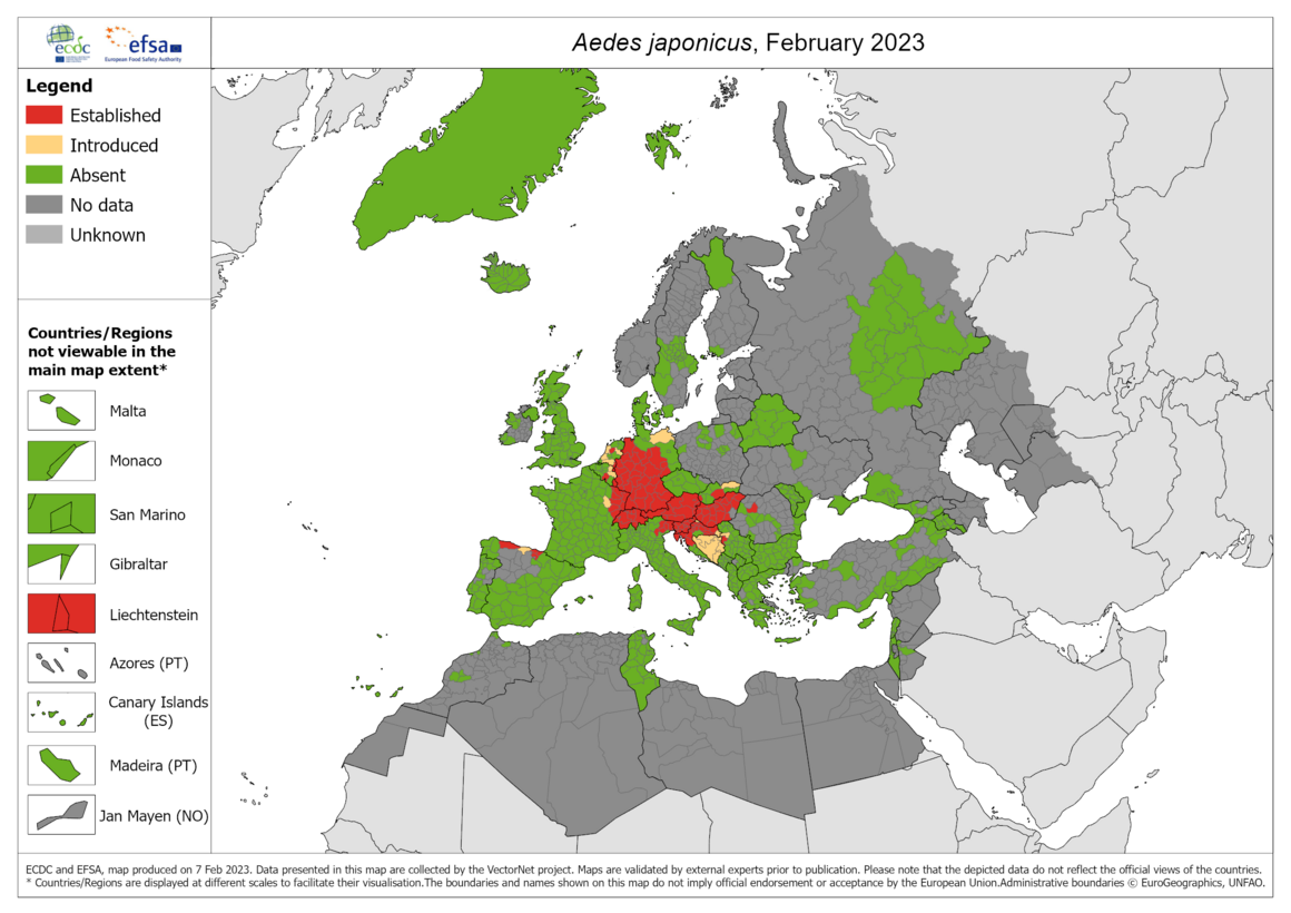 The map shows the current known distribution of Aedes japonicus in Europe at ‘regional’ administrative level, as of February 2023. 1806 new reports were submitted since the previous update (March 2022).