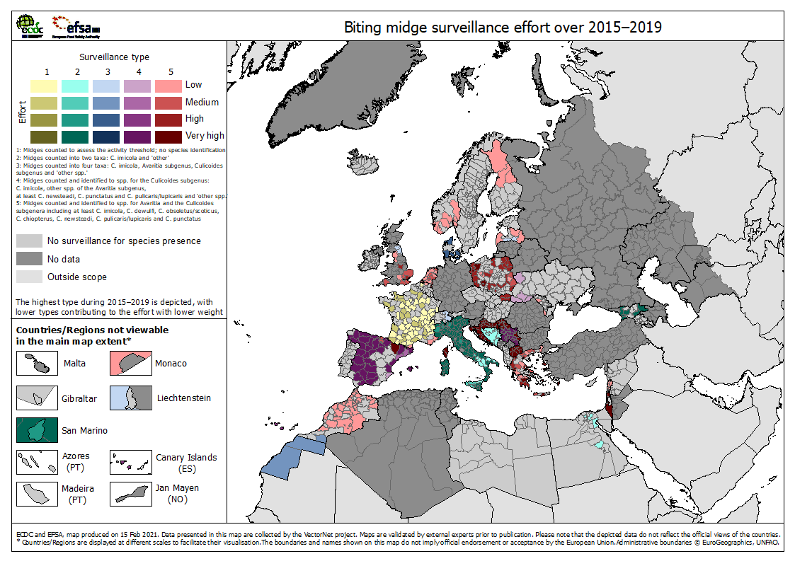 Suggested citation: European Centre for Disease Prevention and Control and European Food Safety Authority. Biting midge maps [internet]. Stockholm: ECDC; 2021. Available from: https://ecdc.europa.eu/en/disease-vectors/surveillance-and-disease-data…”