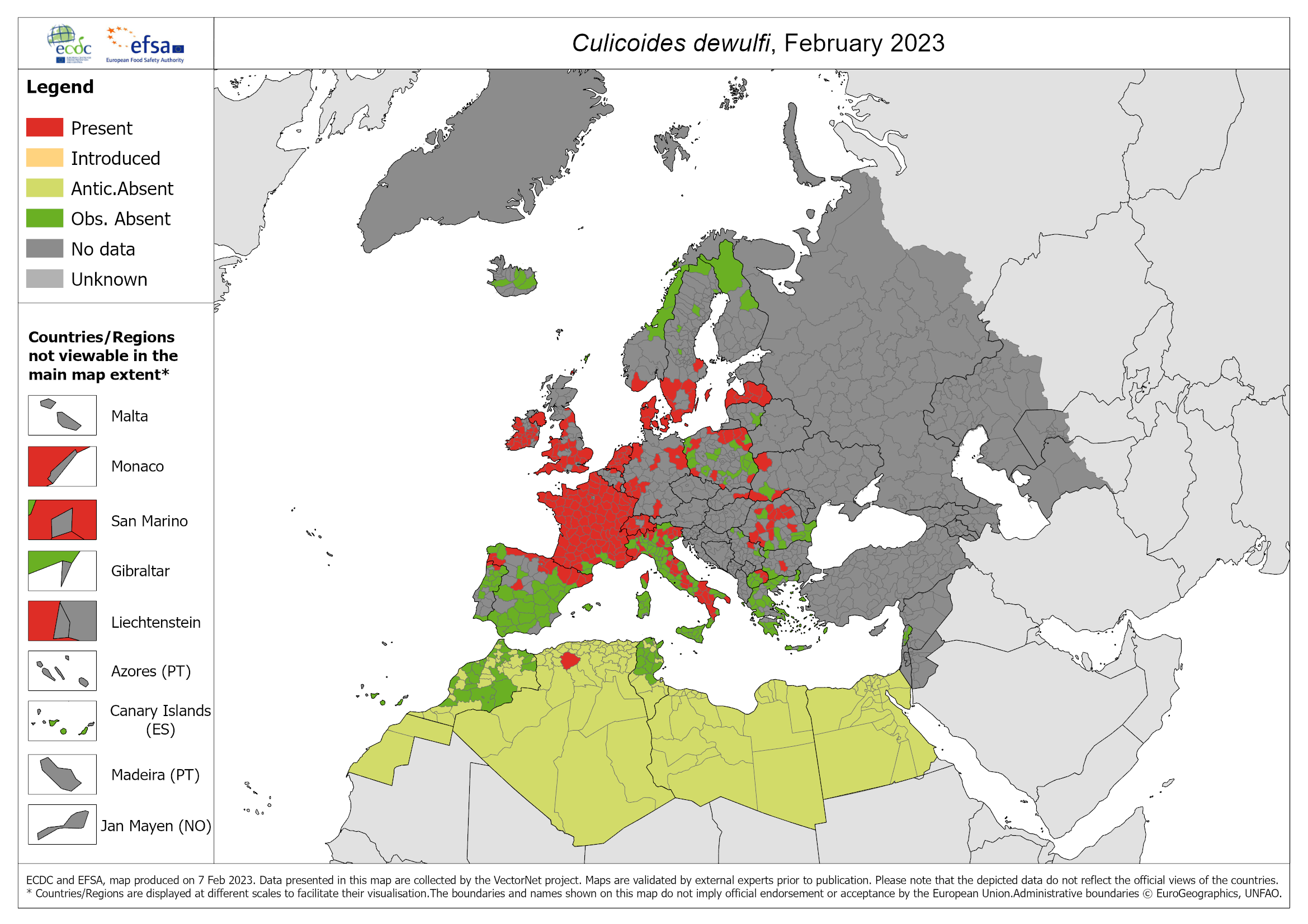 The map shows the current known distribution of Culicoides dewulfi in Europe at ‘regional’ administrative level, as of February 2023. 3352 new reports were submitted since the previous update (March 2022).
