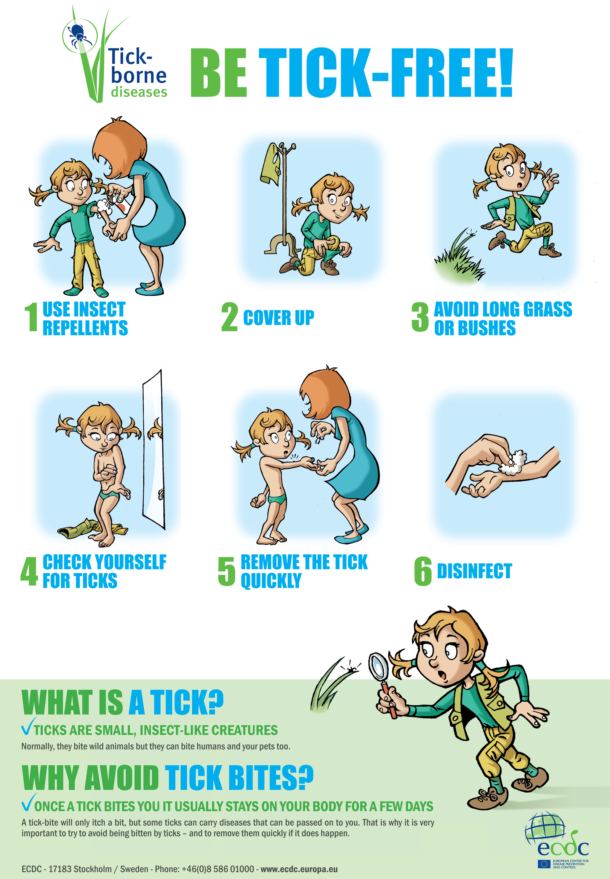 The poster explains six simple steps to being “tick-free”. The poster is intended for display in endemic areas in schools, children’s outdoor sports centres, children’s libraries, etc. (Adaptable templates available)